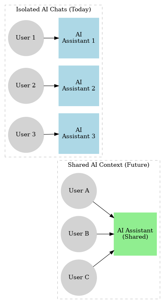 Imagine a team where each member has their own personal AI assistant, but none of those assistants can talk to each other or share notes. If Alice asks her AI a question, Bob’s AI remains clueless about it. Every user is stuck in a separate siloed chat, as if each had an intern with selective amnesia that cannot share or retain knowledge beyond their one-on-one conversation. This is essentially how most AI tools work today: by design, “each thread is completely isolated such that stuff a user writes isn’t shared with other threads” (Under one assistant, is context shared between threads? - API - OpenAI Developer Community). While isolating contexts is good for privacy, it becomes absurd for collaborative work. In a group project, team members often end up copy-pasting information between their individual AI chats, repeating the same prompts, and duplicating efforts. There is no shared memory or awareness across these AI assistants, leading to fragmented knowledge.